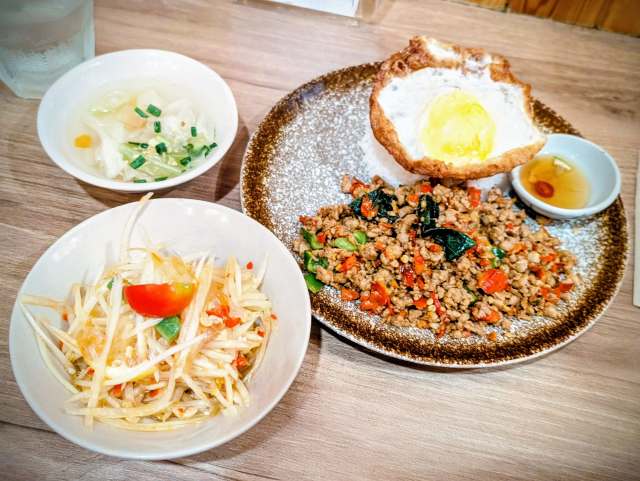 タイ料理「アジアンタワン168(汐留)」でランチ「ガパオ炒めごはん」(※サイドのグリ···