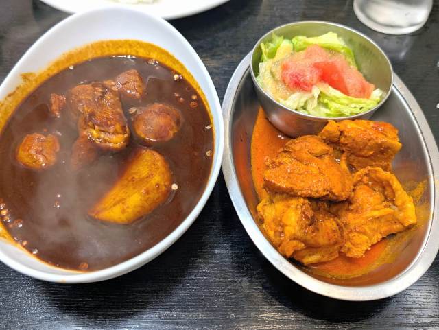 「ラホール外神田店」で漆黒の「ブラック」と赤茶褐色の「インド風」をメンチカツ+野菜で