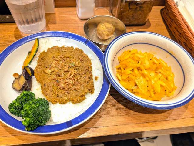 「ラホール外神田店」で漆黒の「ブラック」と赤茶褐色の「インド風」をメンチカツ+野菜で