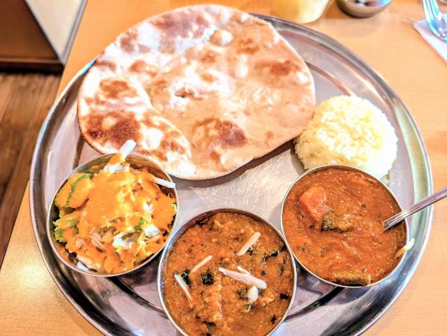 インド料理「アールティ」でランチBセット「カレー2種(日替わり「小松菜とじゃがいも)」+全粒粉のロティ」